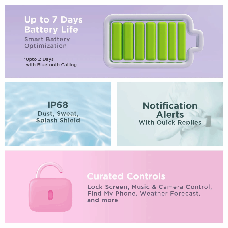 • 20 inbuilt Watch Faces- Be Spoilt for choice, with 20+ inbuilt watch faces. Find the one that matches your vibe with over 100+ on the cloud.