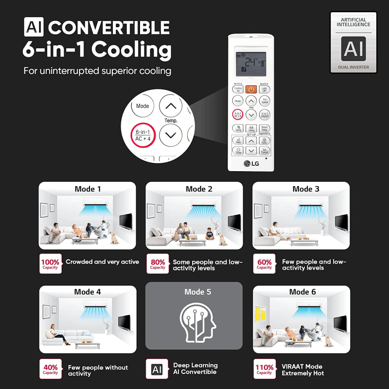 Split Ac With Inverter Compressor: Variable Speed Compressor Which Adjusts Power Depending On Heat Load |With AI Convertible 6-in-1 user gets the flexibility to increase or decrease cooling capacity as per requirements.