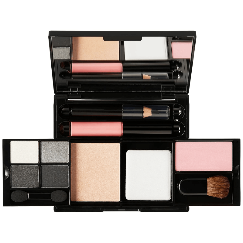 A makeup kit featuring eye shadows and liner, blush, highlighter, and lip coluor - everything you need to go from subtle to smoldering in one sweep