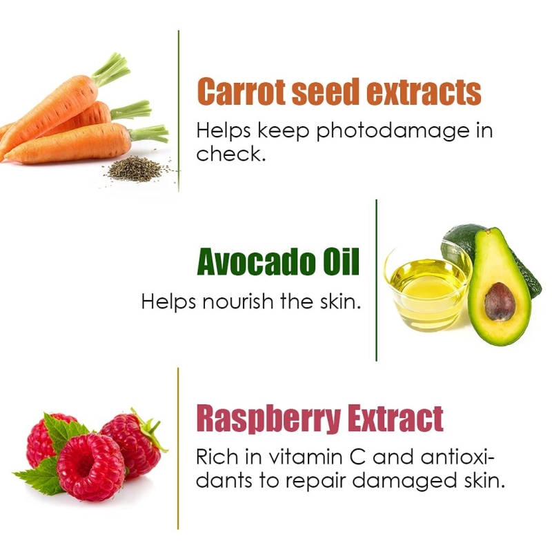 It is infused with high concentration of skin-nourishing natural actives. Delivers the goodness of raspberry extract, carrot seed extract, avocado oil and vitamin E.