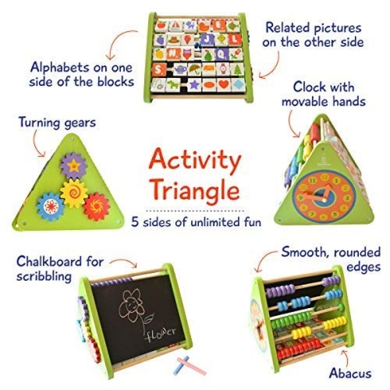 5-IN-1 MULTI ACTIVITY TOY: Long lasting premium quality wooden 5-sided multi-activity toy, with abacus, alphabet swivel blocks with pictures, chalkboard, clock and wooden gears, makes it fun for your child to understand important preschool learning concepts.