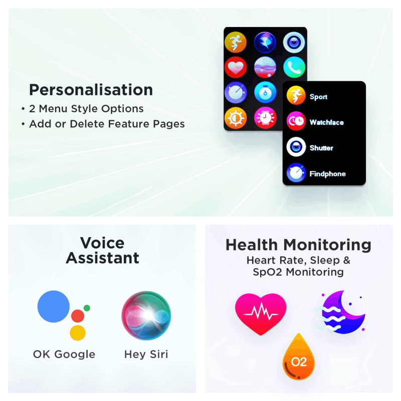 • 20 inbuilt Watch Faces- Be Spoilt for choice, with 20+ inbuilt watch faces. Find the one that matches your vibe with over 100+ on the cloud.