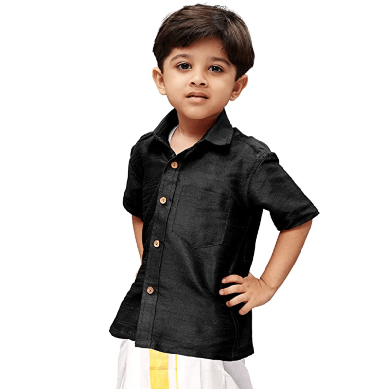 Its spread collar accentuates its sophisticated charm, while the regular fit highlights its timeless appeal. This ethnic shirt, has a button placket, half sleeves, patch pocket and curved hem. These are perfect accompaniments for a silk dhoti for traditional occasions and also on trousers for a formal, classy look. In souther part of the subcontinent these shirts are widely adorned boys boys and men as a traditional wear for any auspicious occasion.