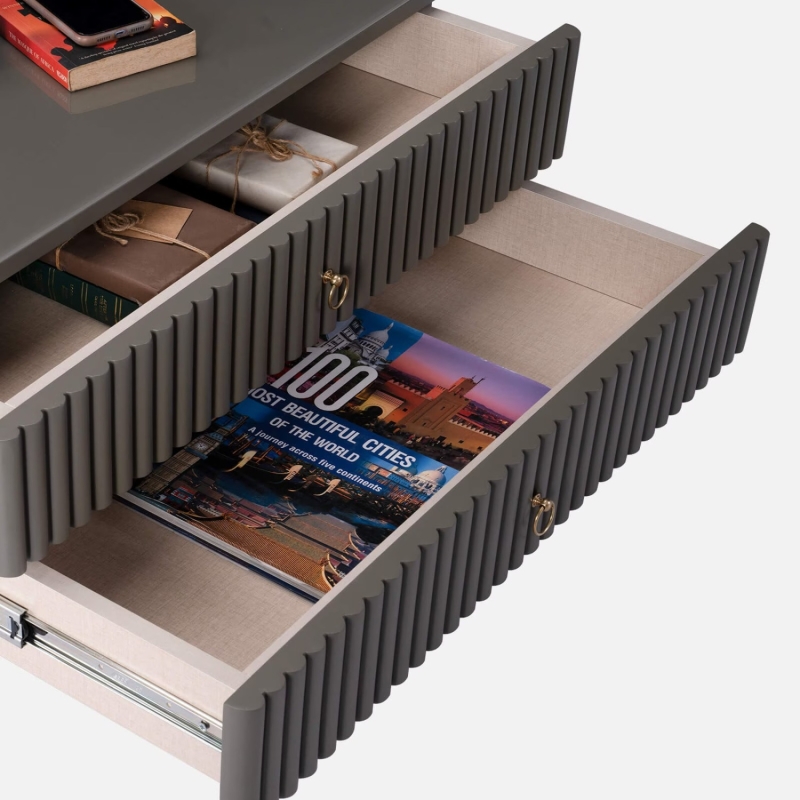 Two roomy drawers offer ample storage for collectibles and essentials.