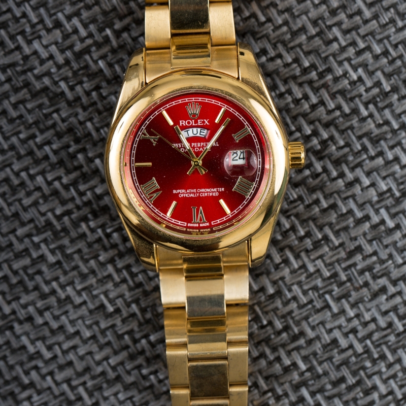 This Oyster Perpetual DAY-DATE 40 in 18 CT yellow gold with a red dial, fluted bezel and a president bracelet.