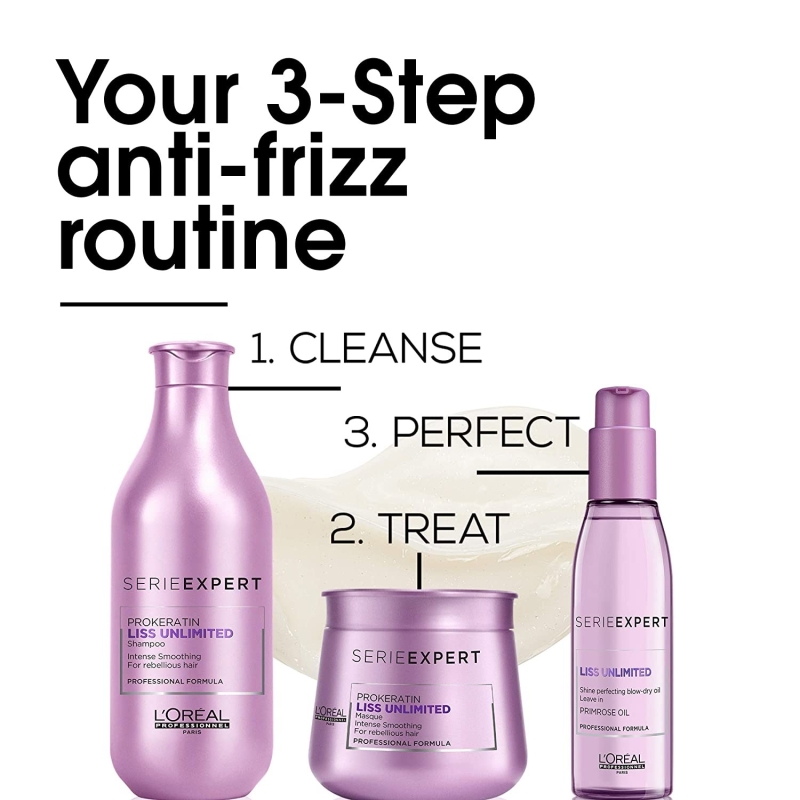 Expert smoothing serum to tame frizzy hair and add shine. The L’Oréal Professionnel Serie Expert Liss Unlimited Shine Perfecting Blow-Dry serum, infused with the power of evening primrose, provides a long-lasting, anti-humidity shield that controls rough hair and keeps it frizz-free. This light expert formula gives hair fabulous shine and smoothness.