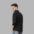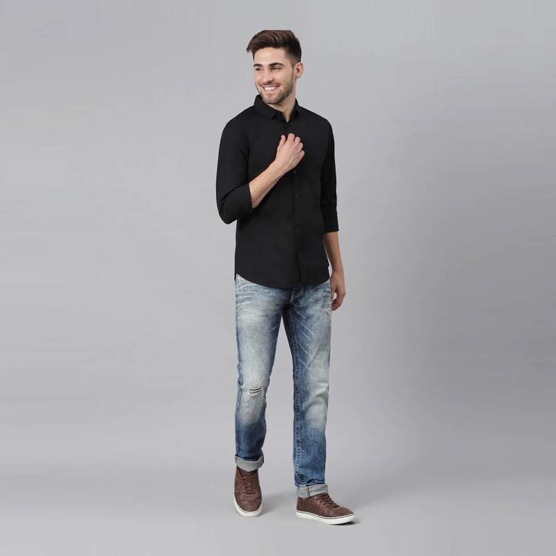 Black solid casual shirt, has a spread collar, button placket, and curved hem